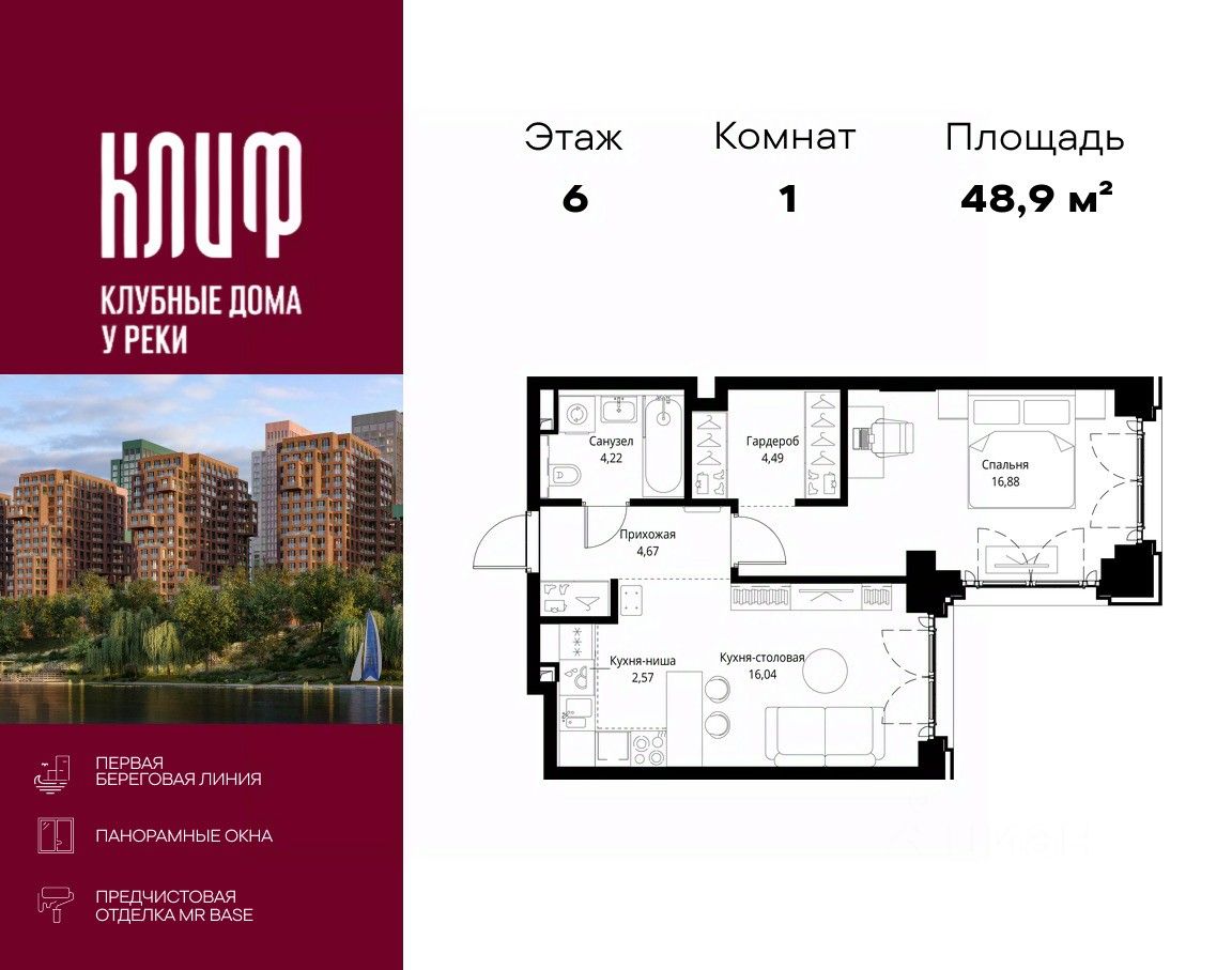 Продаётся 1-комнатная квартира общей площадью 48.87 м² с предчистовой отделкой в ЖК Сити Бэй, квартале Клиф, на 6-м этаже 15 этажного дома.