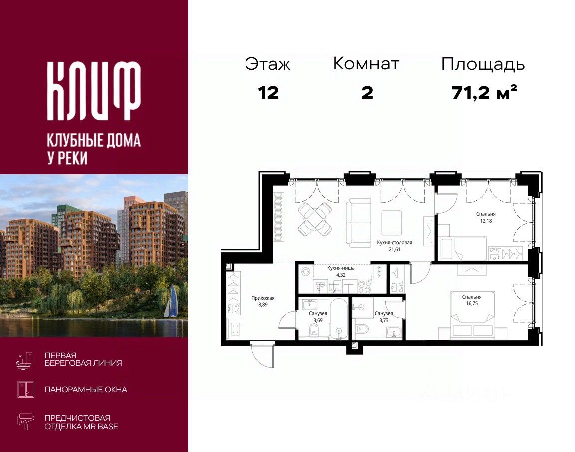 Продаётся 2-комнатная квартира общей площадью 71.17 м² с предчистовой отделкой в ЖК Сити Бэй, квартале Клиф, на 12-м этаже 15 этажного дома.