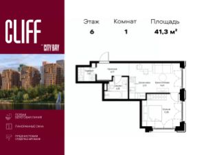 Продаётся 1-комнатная квартира общей площадью 41.27 м² с предчистовой отделкой в ЖК City Вау, квартале Cliff, на 6-м этаже 15 этажного дома.