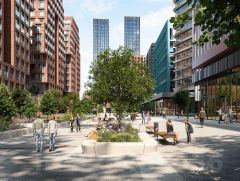Со стороны южного фасада, обращенного к воде, находится прогулочная зона, организующая входы в жилые секции. Вдоль северного фасада пятой очереди проходит общеквартальный озелененный бульвар с тематическими зонами и дворовыми территориями. В каждой секции предусмотрены сквозные входные группы, а между секциями - проходы для пешеходов, связывающие набережную и бульвар с местами для отдыха внутри квартала. Данное решение позволяет сделать комплекс с доступной и безбарьерной городской средой.