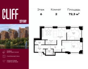 Продаётся 2-комнатная квартира общей площадью 72.31 м² с предчистовой отделкой в ЖК City Вау, квартале Cliff, на 6-м этаже 15 этажного дома.