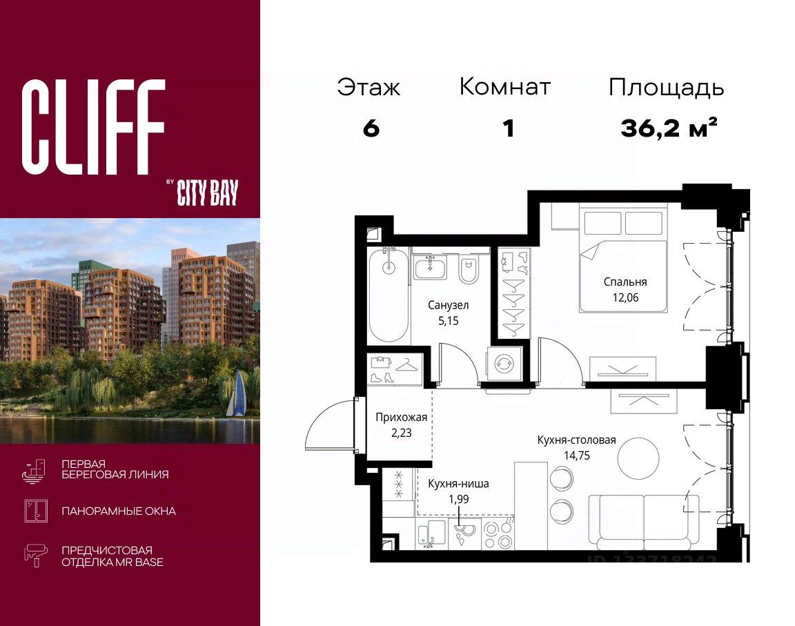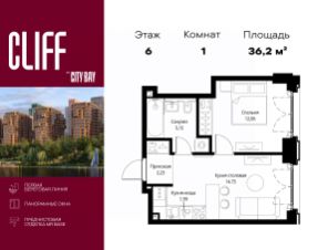 Продаётся 1-комнатная квартира общей площадью 36.18 м² с предчистовой отделкой в ЖК City Вау, квартале Cliff, на 6-м этаже 15 этажного дома.
