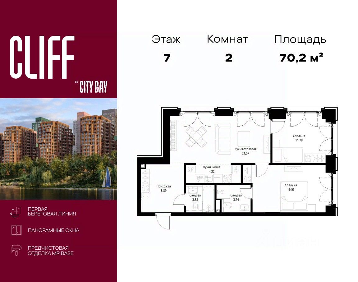 Продаётся 2-комнатная квартира общей площадью 70.23 м² с предчистовой отделкой в ЖК City Вау, квартале Cliff, на 7-м этаже 15 этажного дома.