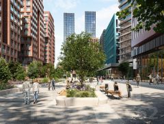 Со стороны южного фасада, обращенного к воде, находится прогулочная зона, организующая входы в жилые секции. Вдоль северного фасада пятой очереди проходит общеквартальный озелененный бульвар с тематическими зонами и дворовыми территориями. В каждой секции предусмотрены сквозные входные группы, а между секциями - проходы для пешеходов, связывающие набережную и бульвар с местами для отдыха внутри квартала. Данное решение позволяет сделать комплекс с доступной и безбарьерной городской средой.