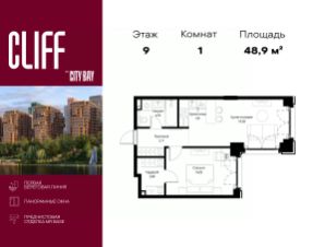Продаётся 1-комнатная квартира общей площадью 48.86 м² с предчистовой отделкой в ЖК City Вау, квартале Cliff, на 9-м этаже 15 этажного дома.