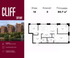 Продаётся 3-комнатная квартира общей площадью 80.70 м² с предчистовой отделкой в ЖК City Вау, квартале Cliff, на 14-м этаже 15 этажного дома.
