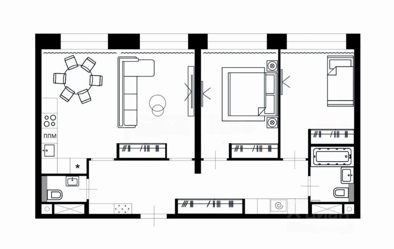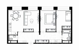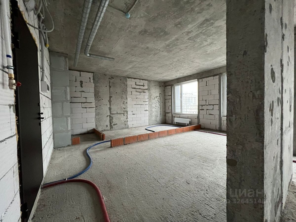Квартира без отделки. Площадь позволяет организовать кухню-гостиную, две спальни, два санузла.