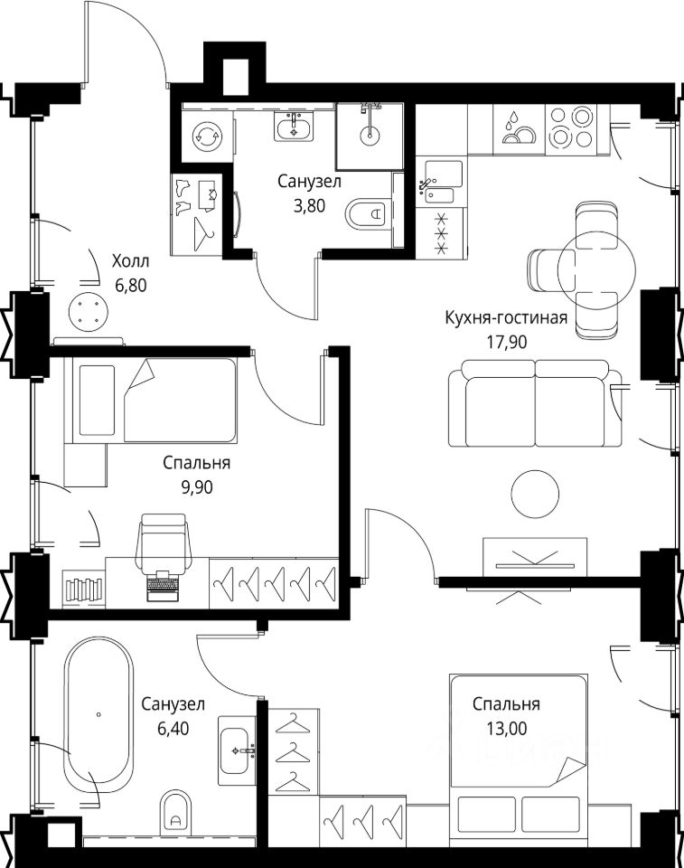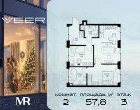 Продаётся 2-комнатная квартира общей площадью 57.80 м² без отделки в ЖК VEER на 3-м этаже 59 этажного дома.