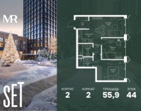 В ЖК SET продается 2-комнатная квартира площадью 55.90 м², расположенная в корпусе 2, на 44 этаже 59 этажного дома.