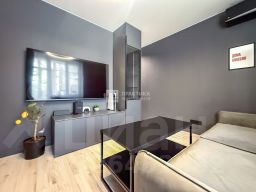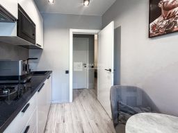 В стоимость квартиры входит кухня, техника, обеденная зона, вся встроенная мебель, кровать, диван. Вся мебель была сделана на заказ. Много мест хранения. Продумано отдельное место для робота-пылесоса. Выделена зона спальни. В квартире два небольших холодильника.