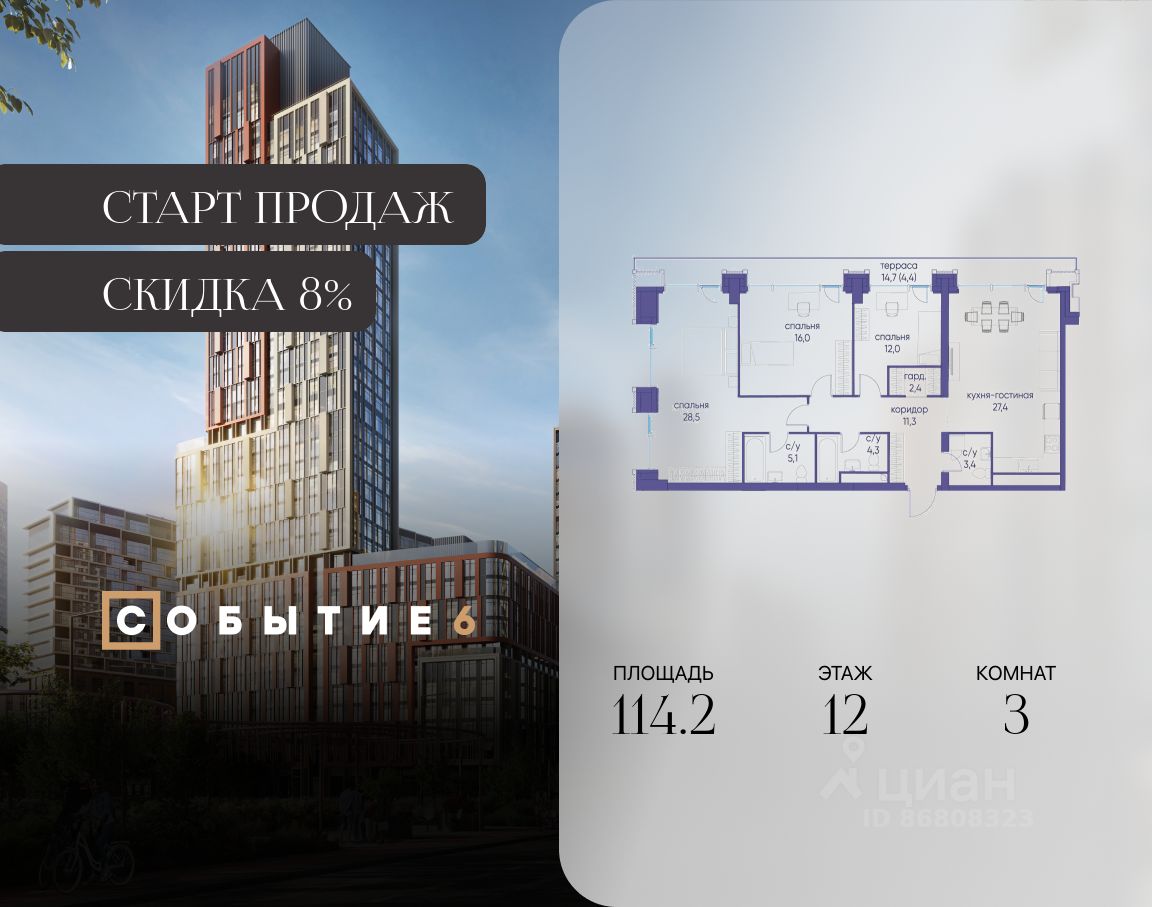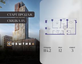 Продаётся 3-комнатная квартира от застройщика: общая площадь 114.20 м², жилая 56.50 м², кухня 27.40 м², 12-й этаж, жилой квартал "Событие-6", корпус 2 (секция 5) Срок сдачи: 1 квартал 2029 года.