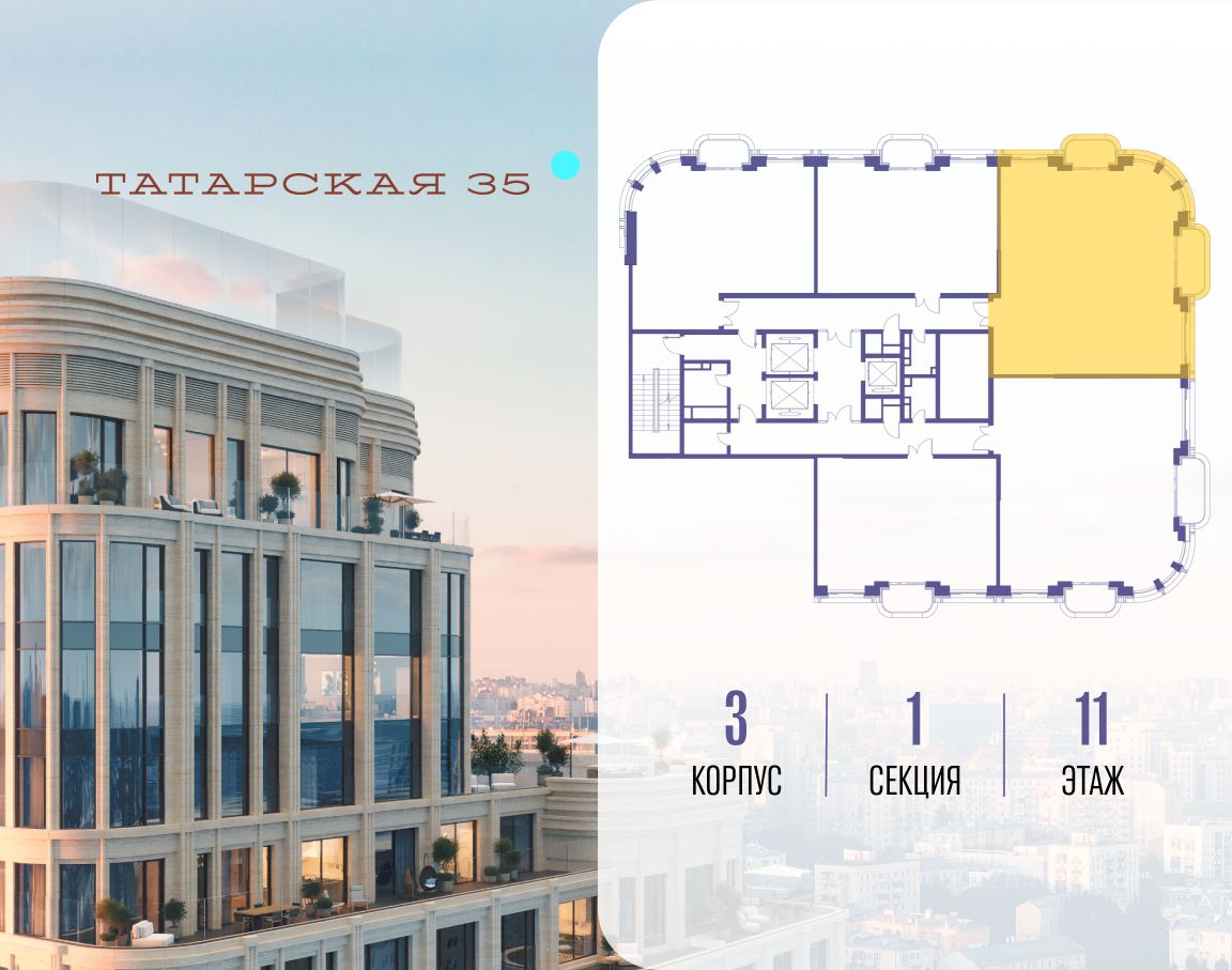 Продается просторная квартира площадью 126.10 м2 в жилом комплексе ТАТАРСКАЯ, 35. Квартира находится в 1 секции корпуса 3. Этаж 11-й из 24. Квартира без чистовой отделки, с просторной кухней 52.20 м2. Жилая площадь 32.60 м2. Высота потолка от 3.50. ТАТАРСКАЯ, 35 - новая архитектурная доминанта Замоскворечья, достопримечательность на фотопанорамах исторического центра Москвы. Элитный дом, созданный для тех, кто умеет смотреть далеко вперед, мыслить масштабно и воплощать собственный сценарий жизни. Вдохновляющие прогулки по променаду набережной, в уютных переулках, в парке "Зарядье", в Михайловском саду и Репинском сквере. Наслаждение высоким искусством в Третьяковской галерее, Доме Музыки, театральном музее им. А.А. Бахрушина, театре на Малой Ордынке. За окнами - Кремль, высотка на Котельнической, панорамы Замоскворечья и острова Балчуг, огни Садового кольца. Собственные спорт-румы, детская, репетиторская, бьюти-пространства, деловое пространство с коворкингом, переговорной и сигарной. Собственный трехуровневый фитнесс-центр с бассейном, тренажерным залом, сауной, хаммамом, массажным кабинетом. Площадь двора - 1,8 га, половина территории покрыта деревьями, кустарниками и лужайками. Дом расположен внутри Садового кольца - отсюда в считанные минуты можно добраться до важнейших мест столицы: достопримечательностей и парков, театров и ресторанов, деловых и административных центров. 7 минут до Кремля на автомобиле, 15 минут до Третьяковской галереи и 8 минут до Садового кольца пешком. Планировочные решения и визуализации предварительны, возможны изменения.