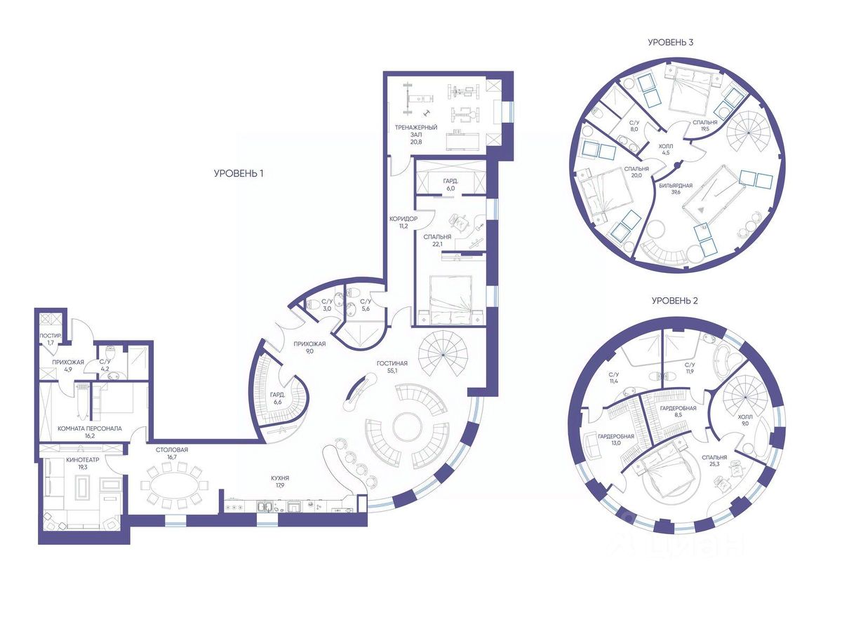 Уникальное предложение - роскошный пентхаус премиум-класса, занимающий три последних этажа в уже заселенном жилом комплексе. Планировка предусматривает размещение 3 спален, 5 гардеробных, 6 ванных комнат. На первом уровне площадью 220,3 м2 возможно устройство кухни-гостиной, тренажерного зала и двух спален с ванными и гардеробными. Второй уровень площадью 79,1 м2 запланирован под мастер-спальню с двумя ванными комнатами и двумя гардеробными. Из окон второго уровня открываются панорамные виды на три стороны света. На третьем уровне площадью 91,6 м2 просторный холл, в котором можно поставить бильярдный стол, оборудовать бар и танцпол, и даже обустроить вместительную сауну.