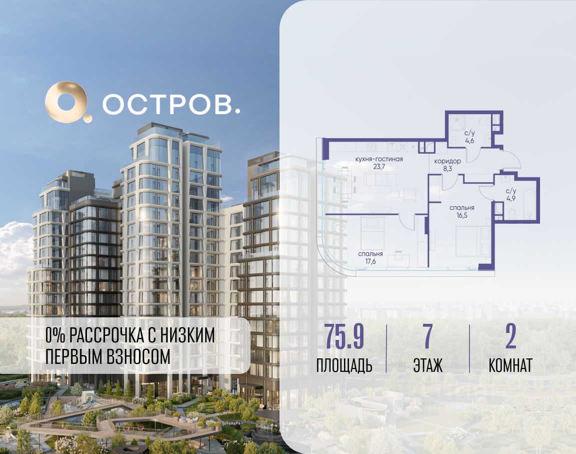 ОСТРОВ.12.1 - часть жилого комплекса на западе Москвы, в 15 минутах езды от центра. Это настоящий заповедник посреди большого города, в окружении реки и 650 га заповедников. Здесь все необходимое находится по соседству: от детского сада до супермаркета, от фитнес-зала до серфинг-центра. На территории созданы все условия для отдыха и общения: клубная инфраструктура в домах и дворы-парки, набережные и променады, маршруты для спортсменов, детей и возрастных жителей. В нескольких минутах ходьбы расположена станция метро "Мнёвники" БКЛ. На автомобиле - 10 минут до Москва-Сити и 15 минут до Садового кольца.