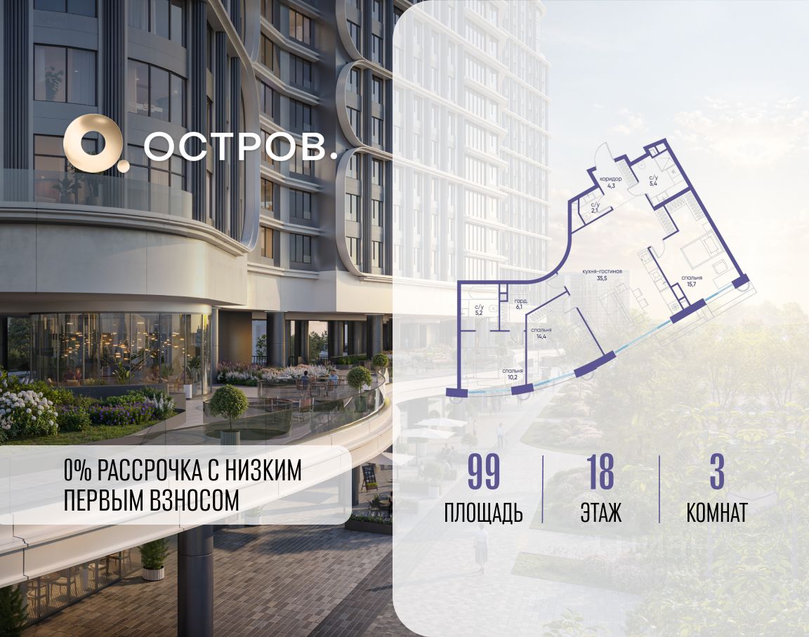 Продаётся трехкомнатная квартира от застройщика: общая площадь 99.00 м², жилая 40.30 м², кухня 35.50 м², 18, жилой квартал "Остров 7", корпус 7 (7 квартал) (секция 2). срок сдачи: 4-кв. 2025.