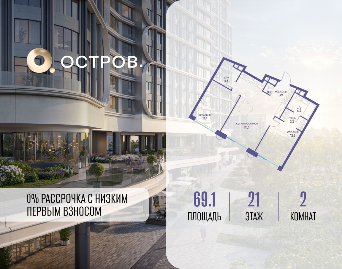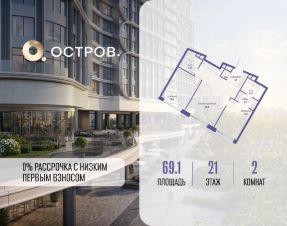Продаётся двухкомнатная квартира от застройщика: общая площадь 69.10 м², жилая 26.00 м², кухня 26.60 м², 21, жилой квартал "Остров 7", корпус 7 (7 квартал) (секция 2). срок сдачи: 4-кв. 2025.