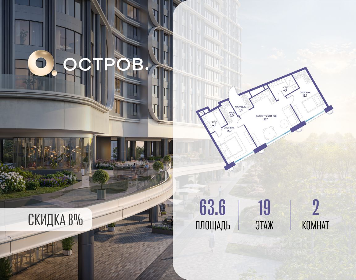 Продаётся двухкомнатная квартира от застройщика: общая площадь 63.60 м², жилая 25.70 м², кухня 22.10 м², 19, жилой квартал "Остров 7", корпус 7 (7 квартал) (секция 2). срок сдачи: 4-кв. 2025.