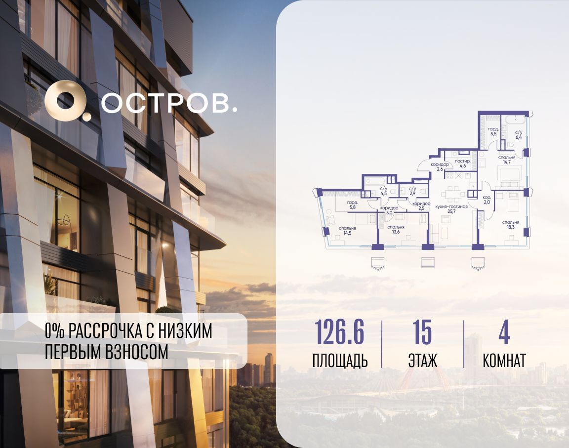 Продаётся четырехкомнатная квартира от застройщика: общая площадь 126.60 м², жилая 61.10 м², кухня 25.70 м², 15, жилой квартал "Остров 12", корпус 3 (12.1 квартал) (секция 1). срок сдачи: 4-кв. 2025.