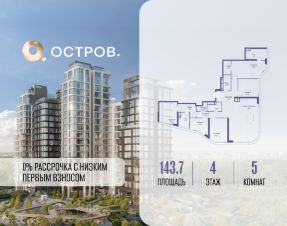 Продаётся квартира от застройщика: общая площадь 143.70 м², жилая 67.20 м², кухня 45.10 м², 4-й этаж, жилой квартал "Остров 12", корпус 2 (секция 1). Срок сдачи: 1 квартал 2029 года.