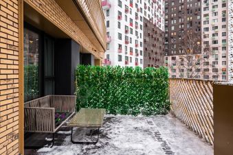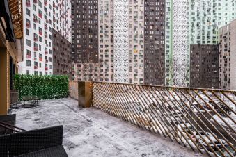 Изюминкой является просторная терраса (30 кв.м.), на которой так приятно наслаждаться утренним кофе или неспешной вечерней беседой. На полу итальянская плитка Atlas Concorde, сама терраса обставлена уютной плетеной и мягкой мебелью, декорирована зеленой изгородью с красивой иллюминацией, есть выдвижная крыша маркиза и возможность поставить современный электрогриль.