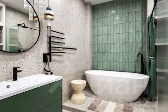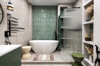 В санузле очень удобная ванная из натурального камня, теплые полы и стена. Во всей квартире дизайнерский свет с различными вариантами освещения, и канальное кондиционирование воздуха.