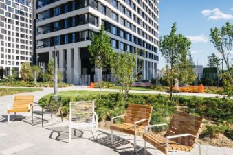 Закрытая территория комплекса: двор без машин, ландшафтный дизайн, зоны отдыха.