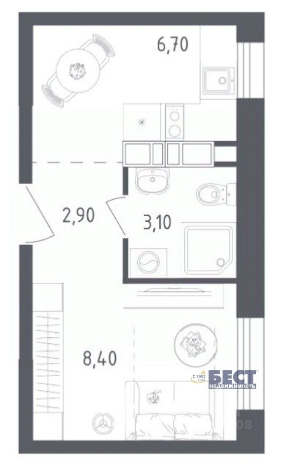 2 изолированных помещения (комната и кухня), 2 окна (в комнате и на кухне),