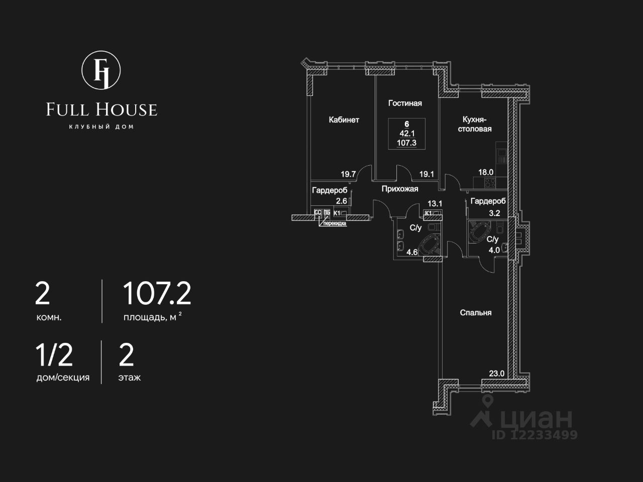 Продается 2-комнатная квартира в ЖК Full House на 2 этаже. Общая площадь квартиры составляет 107,2 кв.м. Квартира без отделки. Жилой комплекс сдан!