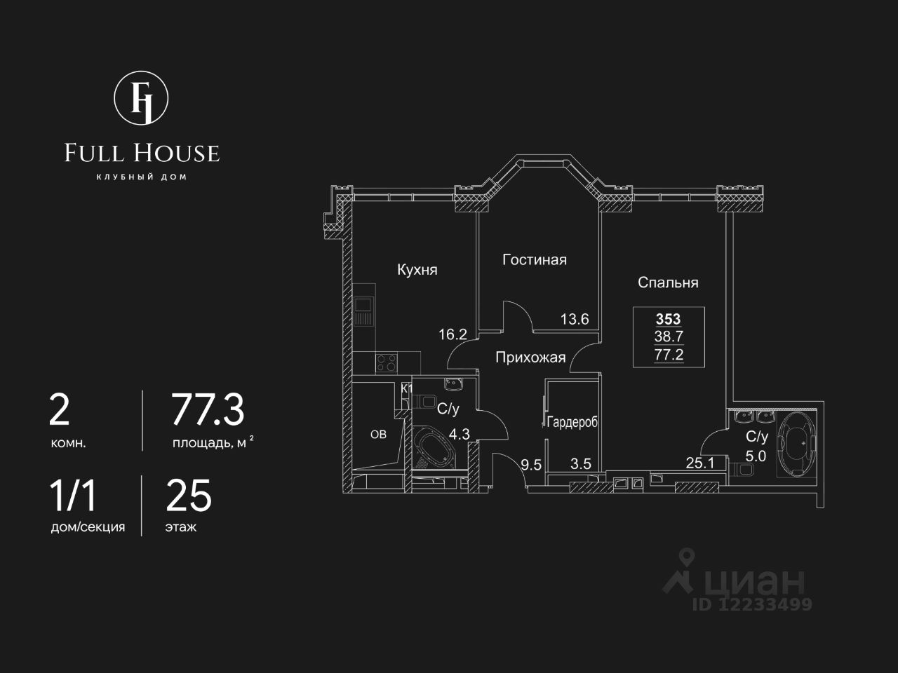 Продается 2-комнатная квартира в ЖК Full House на 25 этаже. Общая площадь квартиры составляет 77,3 кв.м. Квартира без отделки. Жилой комплекс сдан!