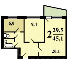• Площадь: общая — 45.1 м², жилая — 29.5 м². Планировка позволяет грамотно зонировать пространство.
