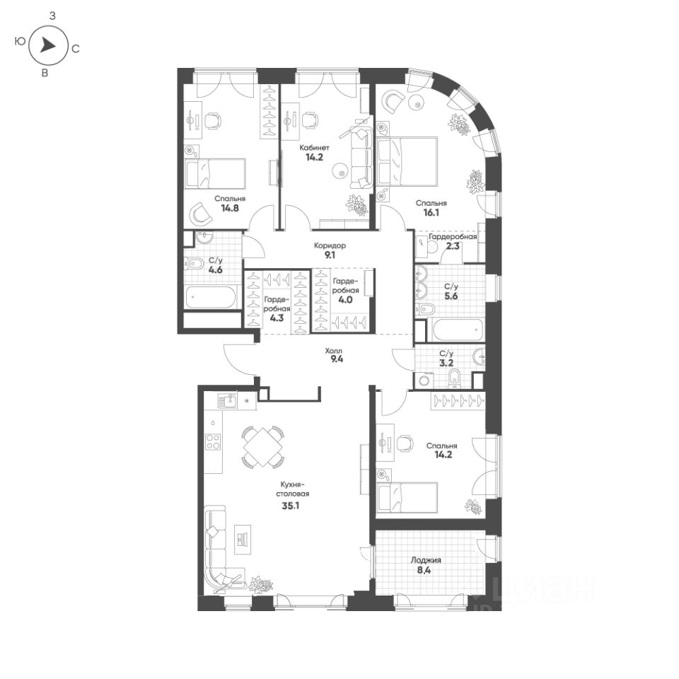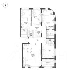 - 4 комнаты - 16,1кв.м +14,2кв.м + 14,8кв.м +14,2кв.м