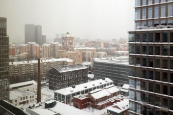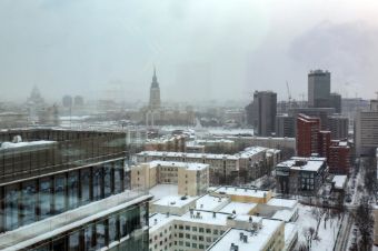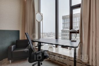 Большие панорамные окна обеспечивают хорошее естественное освещение и открытые виды на город, включая деловой кластер Москва-Сити.