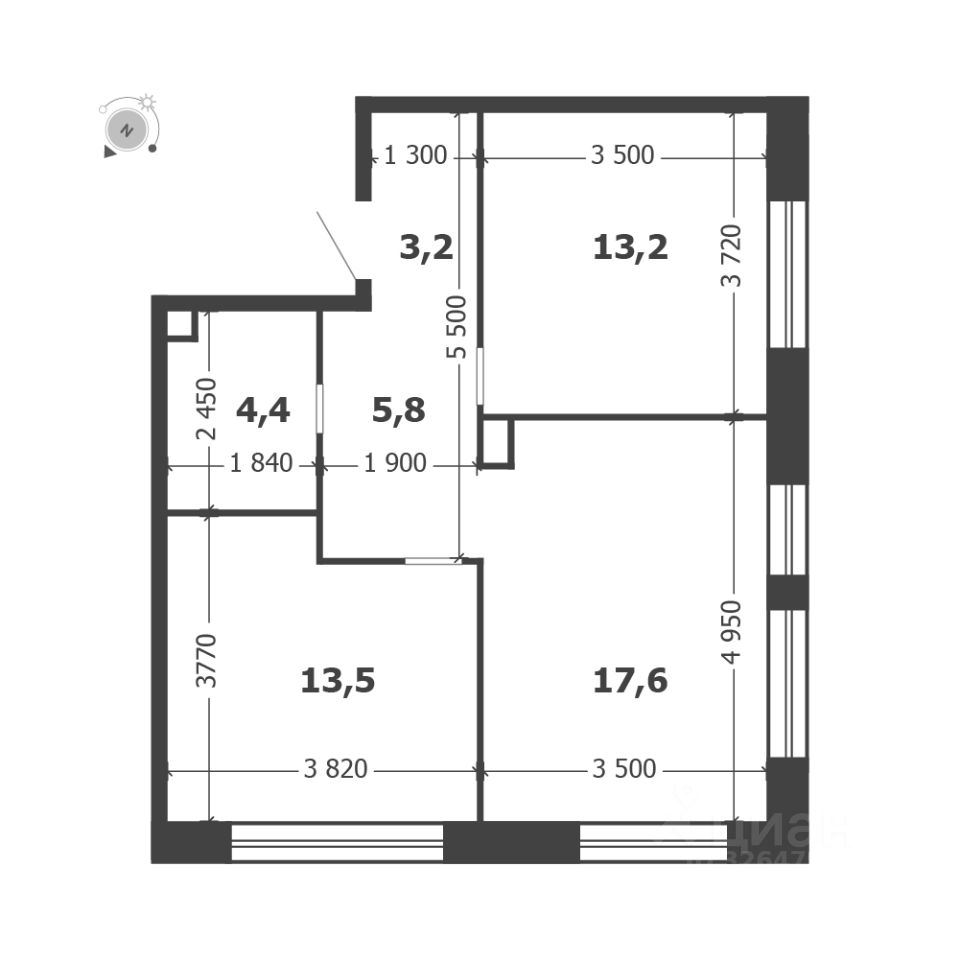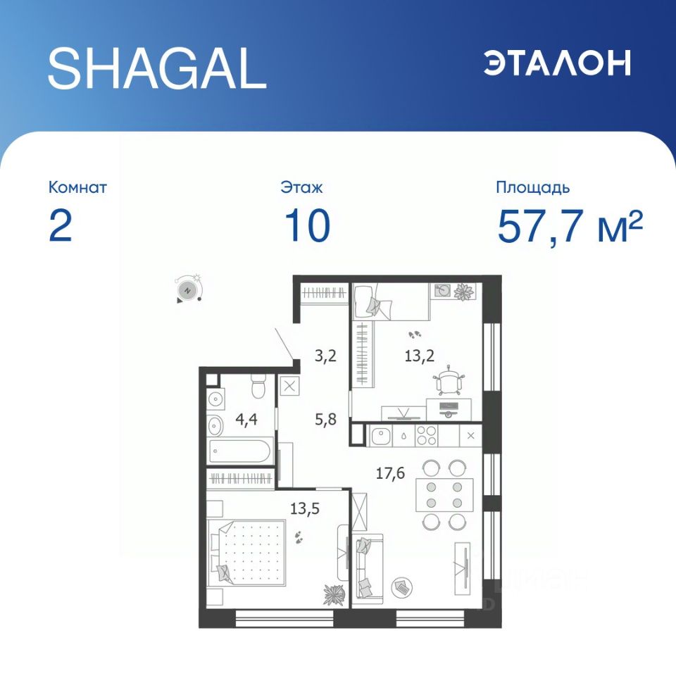 Общая площадь квартиры — 57.7 кв. м, этаж 10 из 18.