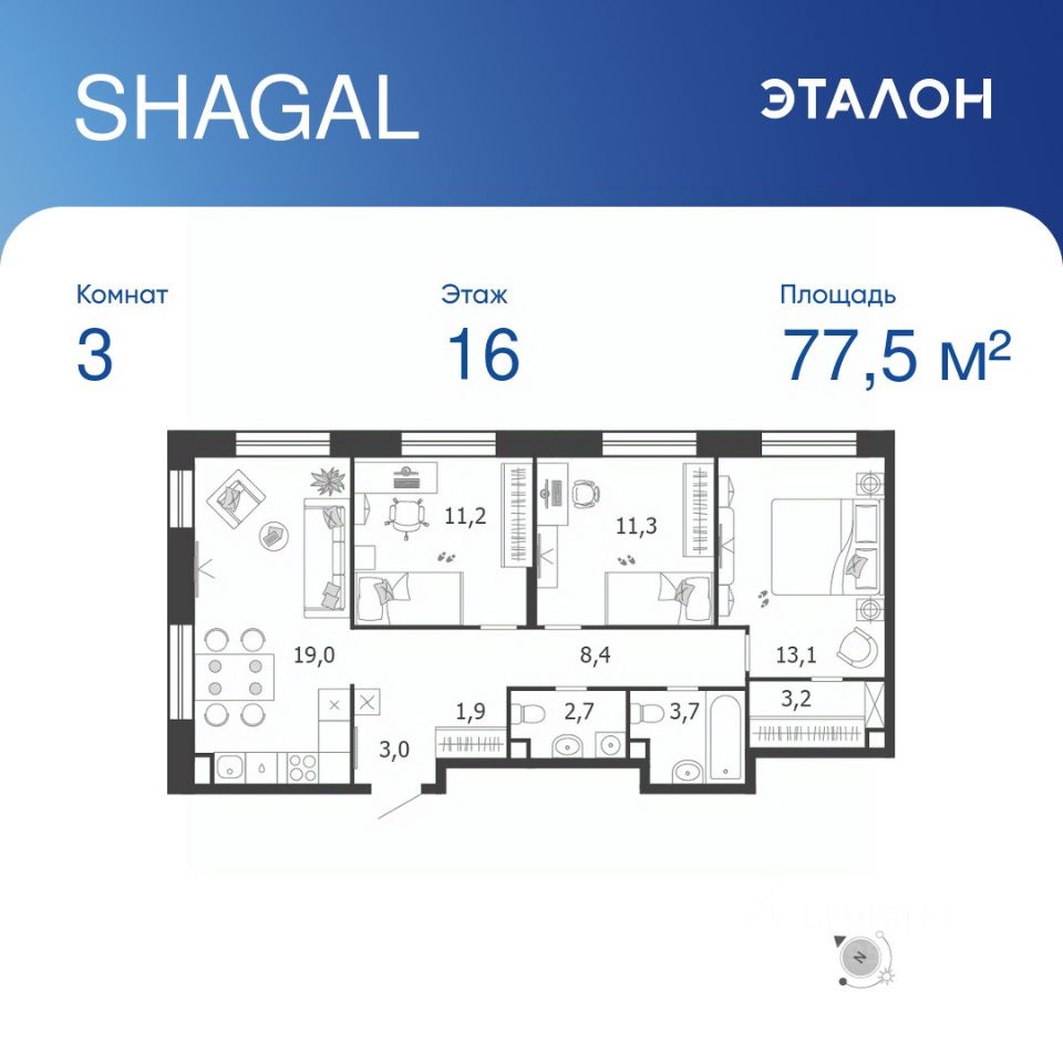 Общая площадь квартиры — 77.5 кв. м, этаж 16 из 17.