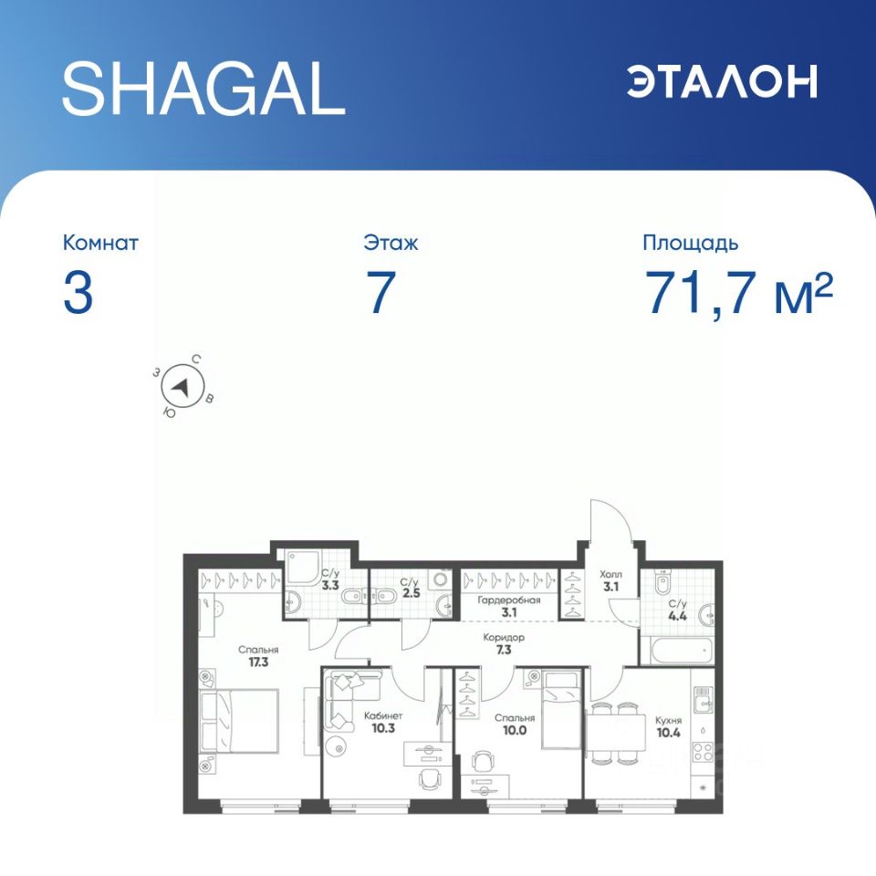 Общая площадь квартиры — 71.7 кв. м, этаж 7 из 8.