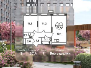 Общая площадь квартиры - 57,4 кв. м, этаж 7 из 19.