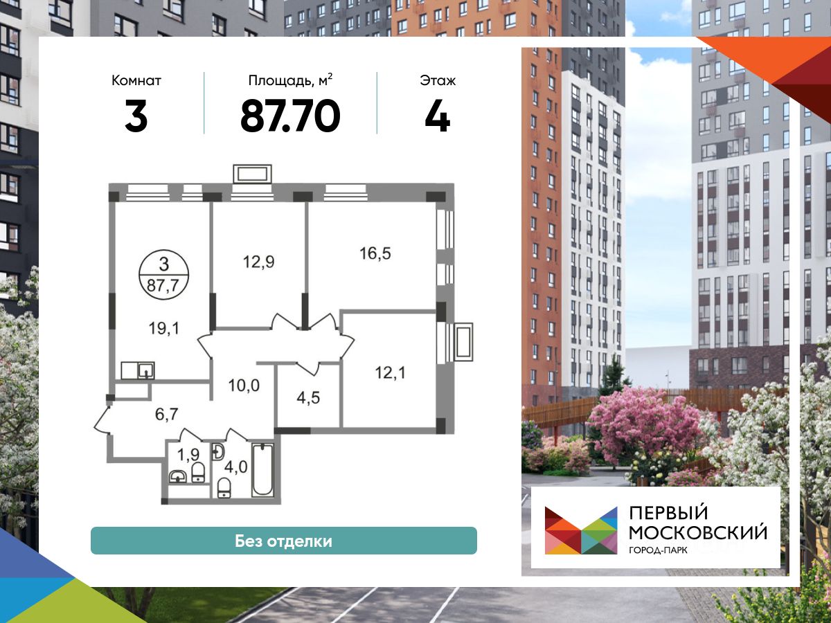 Общая площадь квартиры - 87,7 кв. м, этаж 4 из 19.