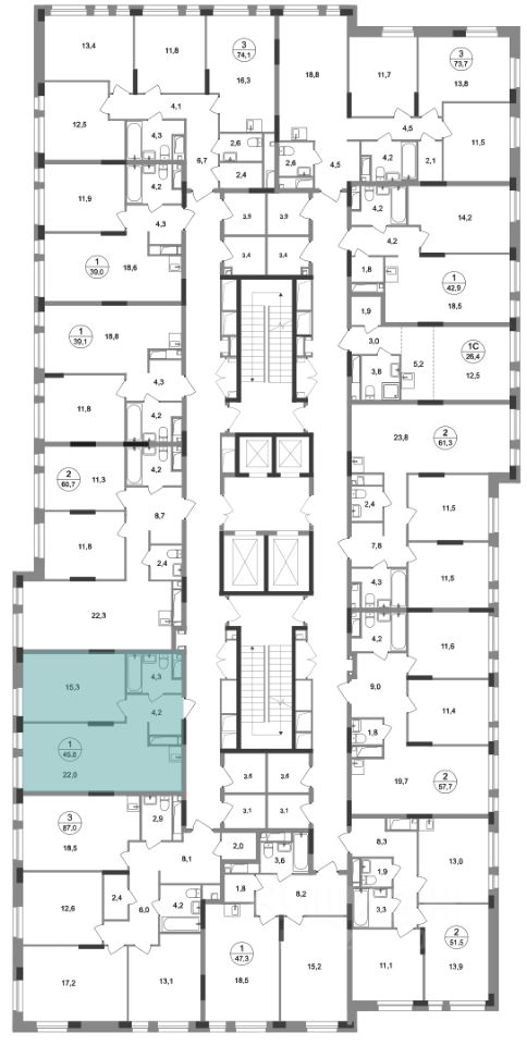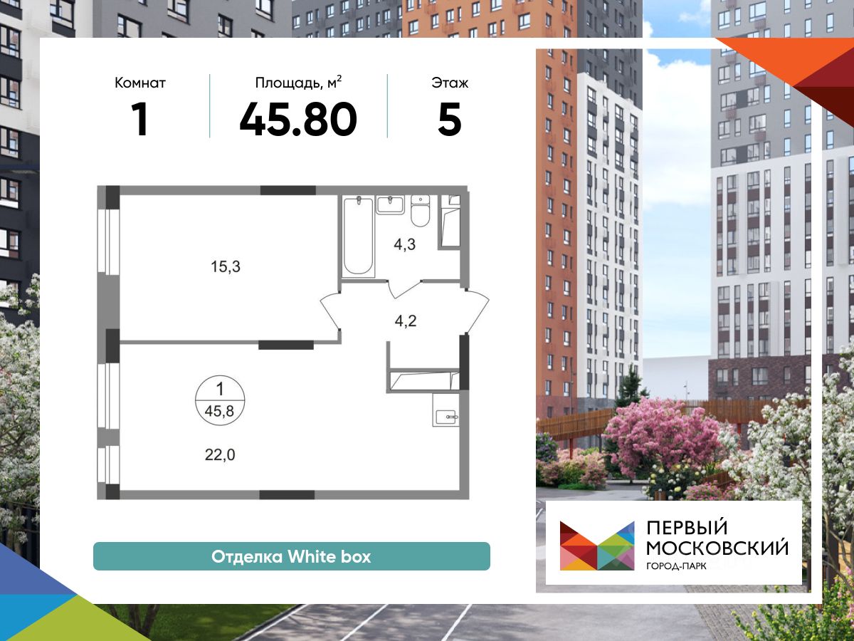 Общая площадь квартиры - 45,8 кв. м, этаж 5 из 19.