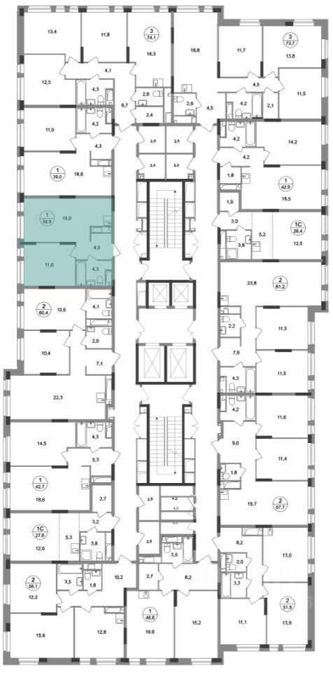 Общая площадь квартиры - 38,9 кв. м, этаж 5 из 19.