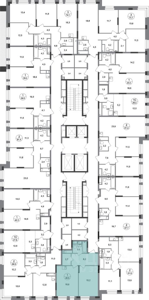 Общая площадь квартиры - 46,6 кв. м, этаж 2 из 19.