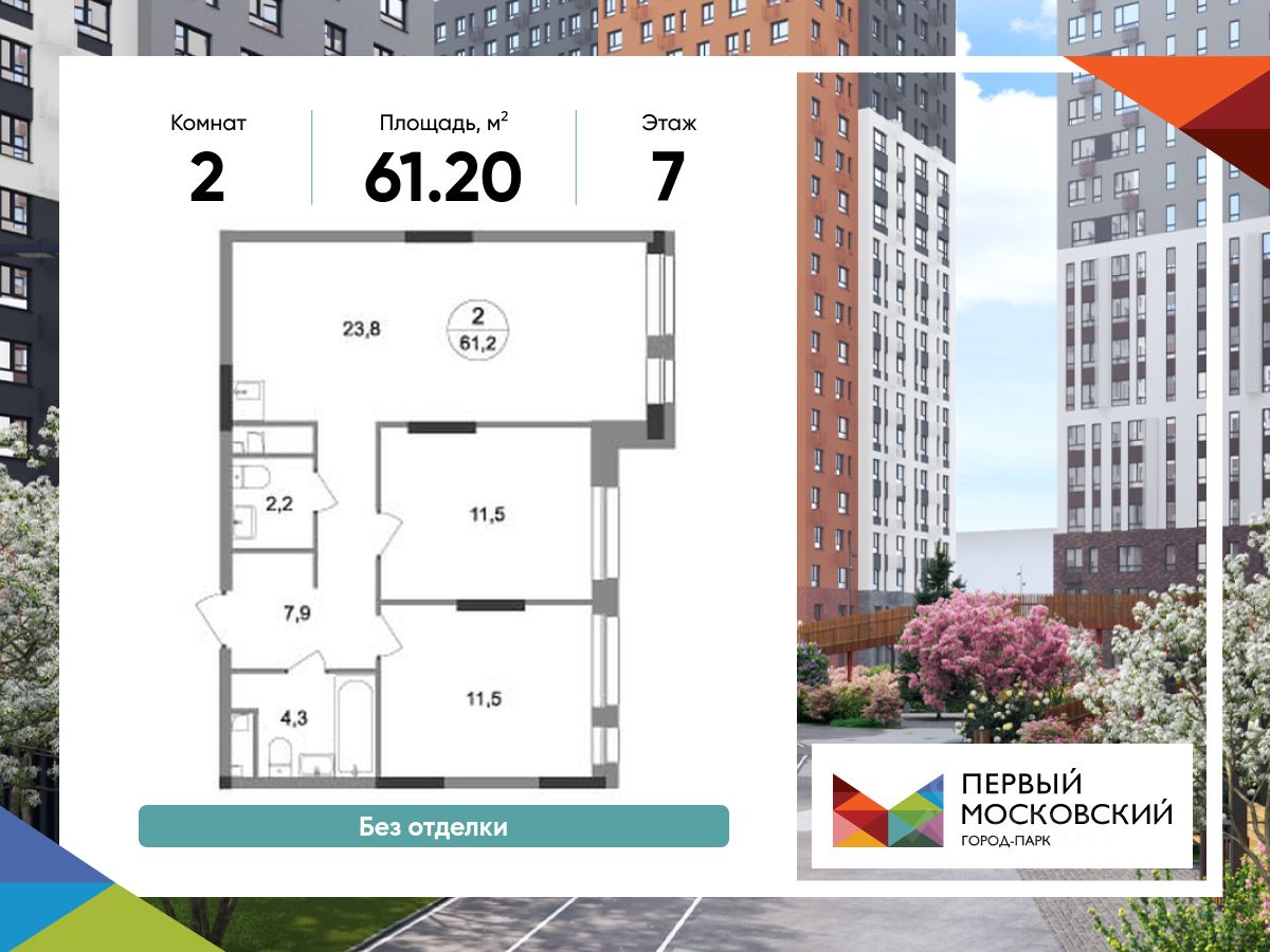 Общая площадь квартиры - 61,2 кв. м, этаж 7 из 19.