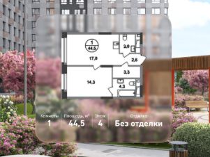 Общая площадь квартиры - 44,5 кв. м, этаж 4 из 20.