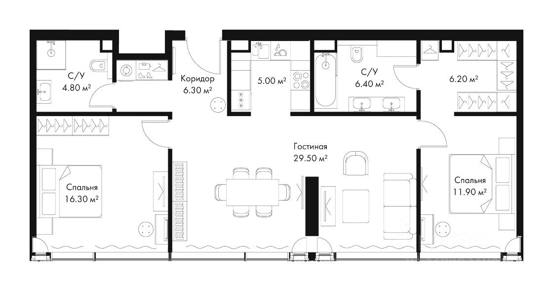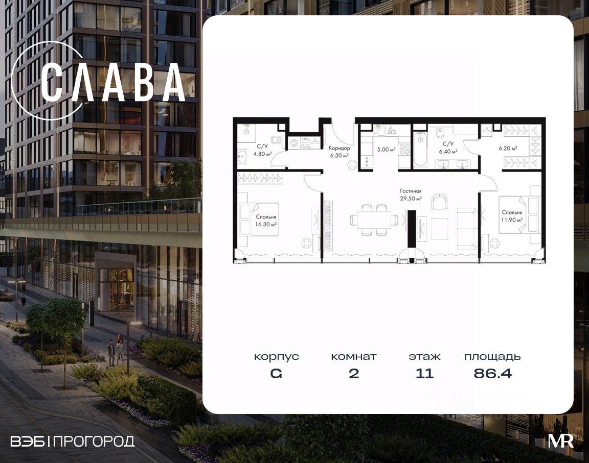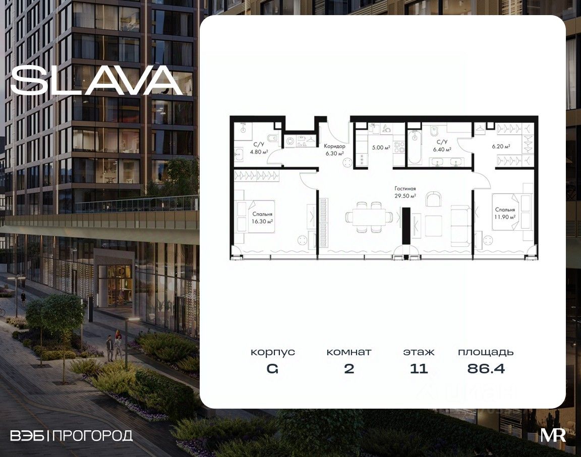 В продаже 2-комнатная квартира площадью 86.40 м² на 11-м этаже корпуса G.