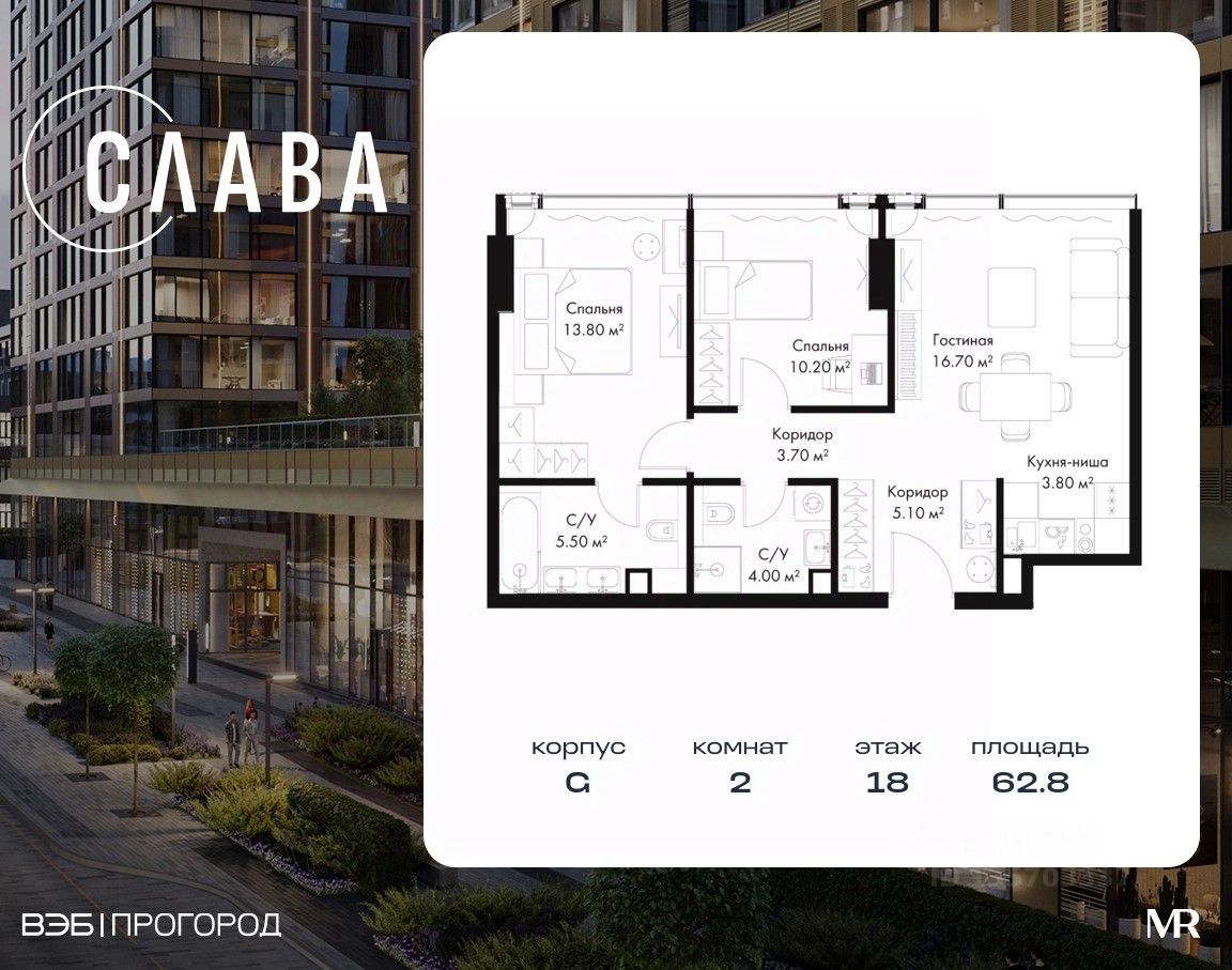 В продаже 2-комнатная квартира площадью 62.80 м² на 18-м этаже корпуса G.