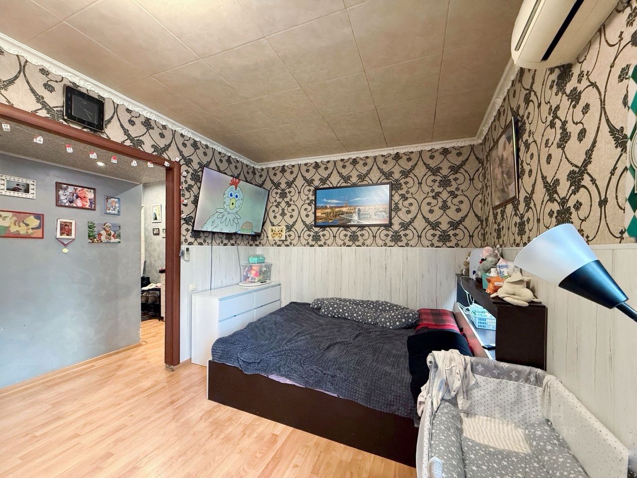 Комната: 18,2 м2 с выходом на застекленный балкон; установлен кондиционер.