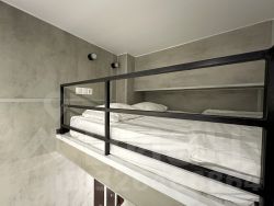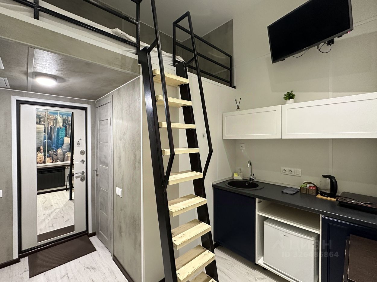 В студии: совмещённый санузел, кухонная зона с мини холодильником, индукционной плитой, местами для хранения посуды и продуктов, кондиционер, вентиляционная система, телевизор, на втором ярусе - спальное место
