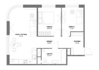 - Евро-трёшка: две отдельные комнаты (14 кв.м. и 11 кв.м) + кухня-гостиная 27 кв.м.