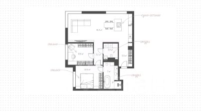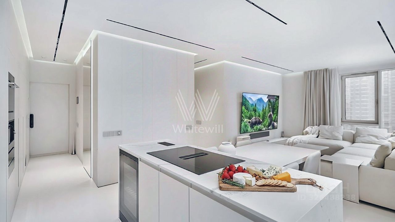 Планировка включает просторную угловую кухню-гостиную с обеденной и ТВ зонами, мастер-спальню с собственным санузлом с ванной и душевой кабиной, вторую спальню или кабинет, санузел и прихожую. Благодаря панорамному остеклению пространство наполнено естественным светом и теплом. Окна ориентированы на две стороны света — северо-запад и северо-восток. За дополнительную плату возможно приобрести 2 машино-места в подземном паркинге и келлер.