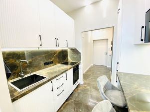 Столешница и фартук из керамогранита. Подсветка рабочей зоны, скрытая вытяжка в общую вентиляцию.