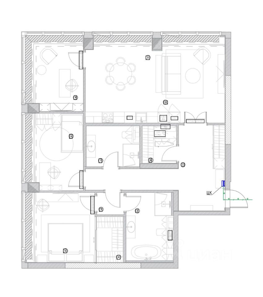 Просторная планировка с тремя изолированными комнатами и кухней-гостиной.
